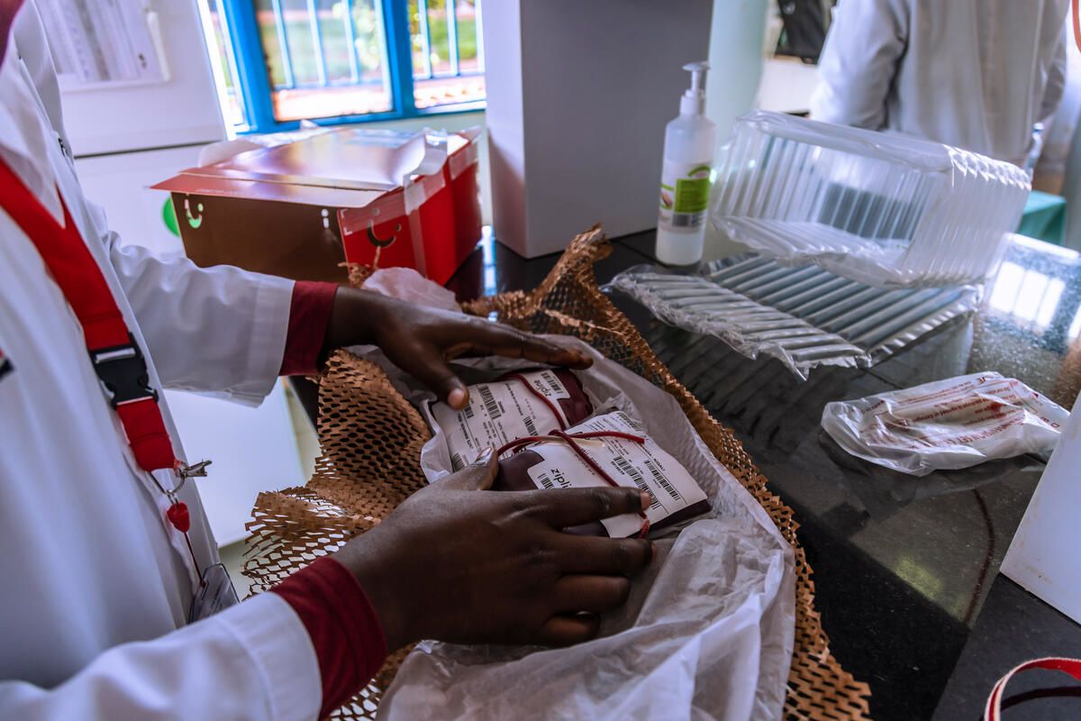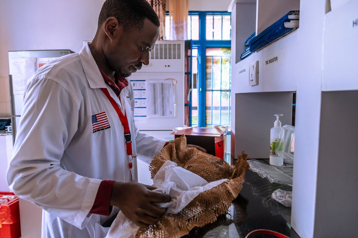 Lab technician Xavier unboxes the Zipline delivery, inspects and registers the blood packages before refrigerating them.