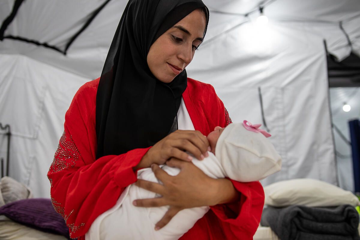 Tima* (26) holds her one-day-old baby Lana* at Save the Children's maternity unit in Gaza.